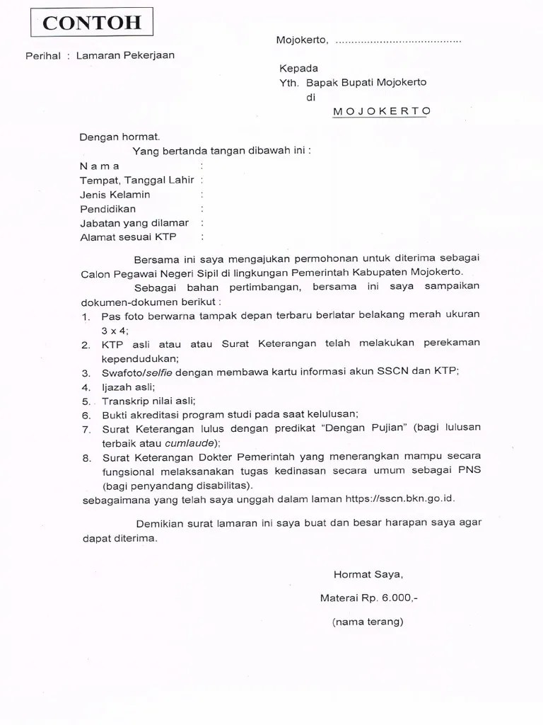 *) berkas nomor 7 hanya berlaku bagi putra/putri lulusan terbaik berpredikat "dengan pujian"/cumlaude. Download & view contoh surat lamaran cpns as pdf for free. Apabila dikemudian hari ditemukan data yang tidak benar, maka saya menerima keputusan panitia membatalkan keikutsertaan/kelulusan saya pada seleksi cpns . Dengan ini menyampaikan surat lamaran agar dapat mengikuti seleksi. Berikut link download contoh pdf surat lamaran dan surat pernyataan seleksi cpns kemenhub ri 2021 untuk mendaftar di sscasn.bkn.go.id.